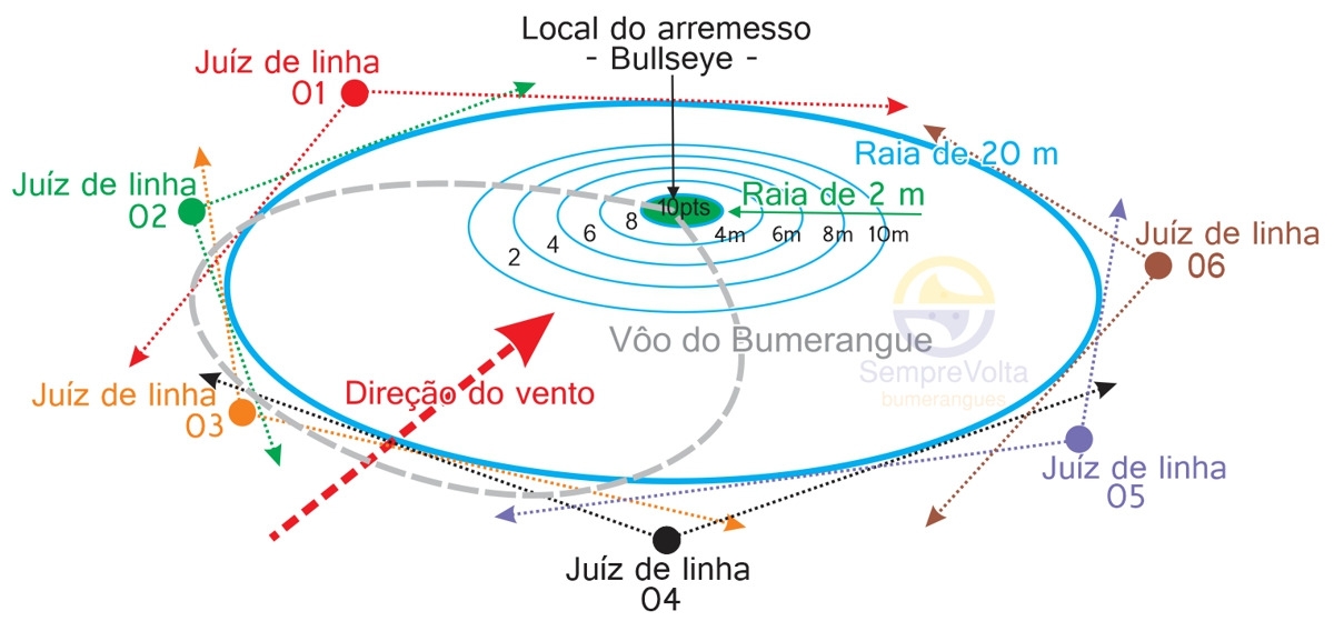 Exemplificando: Tomando como base a linha tracejada em cinza, que representa o trajeto do vôo do bumerangue, os Juízes de linha 01, 02, 03 e 04 levantarão um dos braços validando o arremesso e os Juízes de linha 05 e 06 não poderão validar, pois a linha de tangente não está dentro da área do vôo do bumerangue. Caso um dos juízes não ver o bumerangue dentro de sua linha de tangente, balançará os braços abaixados. Se apenas um juíz levantar o braço, o arremesso é considerado válido.